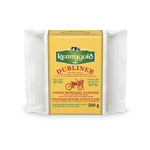 Dubliner® is a robust aged cow’s milk cheese with a bit of a hard texture similar to a Cheddar. In one bite you can taste the diversity of flavors – from nutty to sharp to sweet – that can only come from a natural cheese made from the milk of grass-fed cows. What might seem ambiguous is actually a well-balanced mix of cheese cultures and naturally occurring amino acids. This diversity pays off in its ability to be served alongside a full-bodied wine like Cabernet, a freshly pulled pint of Guinness, or simply melted between a few slices of crusty brown bread. Dubliner® Cheese is even available in a Reduced Fat version.